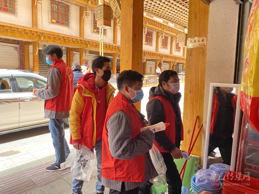 德格縣志愿者為商戶發(fā)放消毒用品。