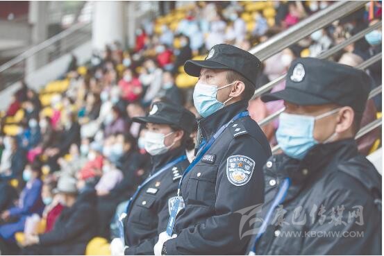 “請出示你的身份證,配戴好口罩?!薄按蟾缒阏义e方向了,你是往那邊走?!薄鞍荩愕奈恢檬峭筮呑??!薄诒遍T體育場,民警除了安保執(zhí)勤以外,還幫助行動不方便的群眾找尋座位,或?yàn)樽稍兊娜罕姶鹨山饣蟆?/p>