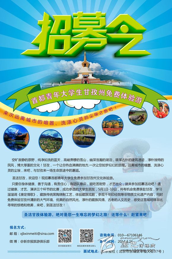 本網(wǎng)訊(本網(wǎng)記者)為進(jìn)一步宣傳展示甘孜州的康巴文化積淀與旅游特色,州委、州政府將舉辦“圣潔甘孜,走進(jìn)北京”的文化旅游周宣傳活動(dòng),在宣傳周前期推出了一個(gè)亮點(diǎn)活動(dòng),就是面向首都各高校公開招募一批青年大學(xué)生赴甘孜州體驗(yàn)生活,讓他們走出都市,感受生態(tài)甘孜的藍(lán)天白云,感悟和諧甘孜的幸福文明,以他們的親身經(jīng)歷為樣本案例,見證新甘孜的獨(dú)特魅力。