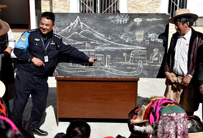 由于轄區(qū)藏族群眾大多都不識(shí)漢字、不會(huì)漢語,巴桑呷瓦便將自己的繪畫技藝運(yùn)用到普法教育中,2018年10月,康定市公安局在對(duì)聯(lián)系鄉(xiāng)甲根壩開展精準(zhǔn)扶貧工作時(shí),在全市范圍內(nèi)抽調(diào)了巴桑呷瓦等10名富有群眾工作經(jīng)驗(yàn)的民警,他一邊負(fù)責(zé)沙德鎮(zhèn)派出所日常工作,一邊負(fù)責(zé)兼職扎日村精準(zhǔn)扶貧工作,用繪畫的方式為牧民群眾描繪脫貧致富夢(mèng)。他把國(guó)家的相關(guān)法律法規(guī)、民族政策和惠民工程政策吃透并制作成故事性強(qiáng)、通俗易通的簡(jiǎn)筆畫冊(cè)向老百姓解讀、宣講。在巴桑呷瓦妙趣橫生、詼諧幽默的“授課”下,深?yuàn)W的法律政策變得淺顯易懂。“他的畫形象生動(dòng),接地氣,有我們的生產(chǎn)生活場(chǎng)景,我們喜歡看,他的講解幽默風(fēng)趣,我們聽得懂,只要他一下來,村民都圍在他的身邊,舍不得離開?!痹沾宓拇迕褚呀?jīng)把這位“畫家”警察當(dāng)作了自家人。