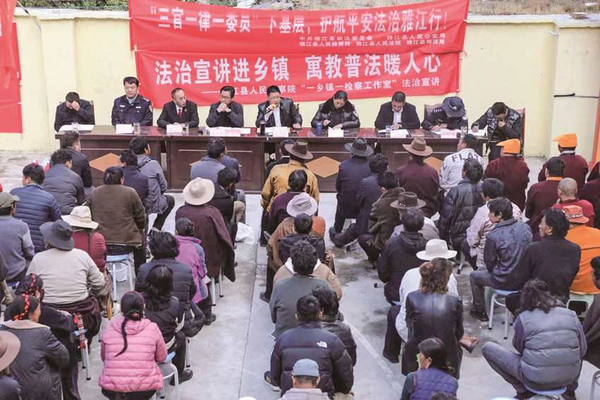 “三官一律一委員”通過高效整合法官、檢察官、警官、律師、政法委員五支力量,緊緊圍繞“155533”市域社會治理總體發(fā)展思路,以“五治融合”為目標(biāo),通過“縣級+鄉(xiāng)鎮(zhèn)”的人員配置、“政策+法律”的職能作用、“法條+案例”的豐富內(nèi)容、“宣講+提問”的互動方式,將單一的宣講工作變?yōu)槎嘣恼勑恼勗?,形成新的“五位一體”工作方法,并致力于化解“五大風(fēng)險(xiǎn)”,強(qiáng)化“五大建設(shè)”,同時鞏固市域社會治理現(xiàn)代化工作成果,探索構(gòu)建合縱之環(huán)、合縱之勢、合縱之力,為建設(shè)更高水平的平安雅江、法治雅江提供了更加堅(jiān)實(shí)的法治保障。