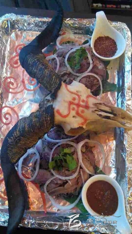 最值得一提的應(yīng)該是兩盤放在羊頭邊上的蘸料。一盤是四川的干辣椒面,里面放了鹽、味精、花椒,是大部分人都能接受的口味。而另一盤辣椒是西藏獨有的藏式辣椒醬,該辣椒的香辣和印度魔鬼椒有得一拼。藏式辣椒是使用涼水調(diào)和而成,只放一些鹽在里面,用羊頭肉沾上那么一點放在嘴里,立刻能感覺到辣味直襲你的味蕾神經(jīng)進入你的大腦,形成一個字“辣”。如果你是不怕的,喜歡吃辣的食客,不妨試試這道“吉祥羊頭”帶給你的火爆。