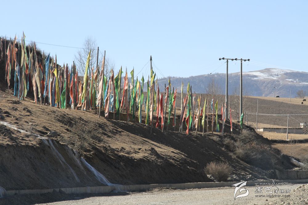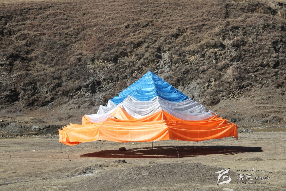 (2)涅槃旗:甘孜州道孚等地沿襲水葬風俗,即埋尸河邊或山坡上有大片涅槃旗,向著河流飄向,有讓死者在地獄里減輕痛苦,盡快得到轉世。