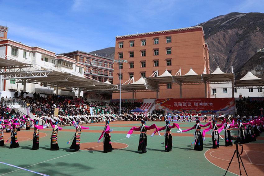 弦音聲動(dòng)鬧新年,紅綾長(zhǎng)袖舞春風(fēng),千人弦子鍋莊,唱出龍年大團(tuán)圓,踏出幸福新舞步……2月13日,在巴塘縣全民健身活動(dòng)中心舉行的春節(jié)暨藏歷新年系列活動(dòng)“文化·點(diǎn)靚生活”——巴塘縣五彩藏鄉(xiāng)藝術(shù)周弦子鍋莊展演活動(dòng)現(xiàn)場(chǎng)喜氣洋洋、人頭攢動(dòng),上千名群眾身穿節(jié)日盛裝,拉起弦胡,載歌載舞,共同慶祝新春佳節(jié),祈盼龍年國(guó)泰民安、風(fēng)調(diào)雨順。圖為活動(dòng)現(xiàn)場(chǎng)。 敖梅 李穎/文 格桑澤仁/圖